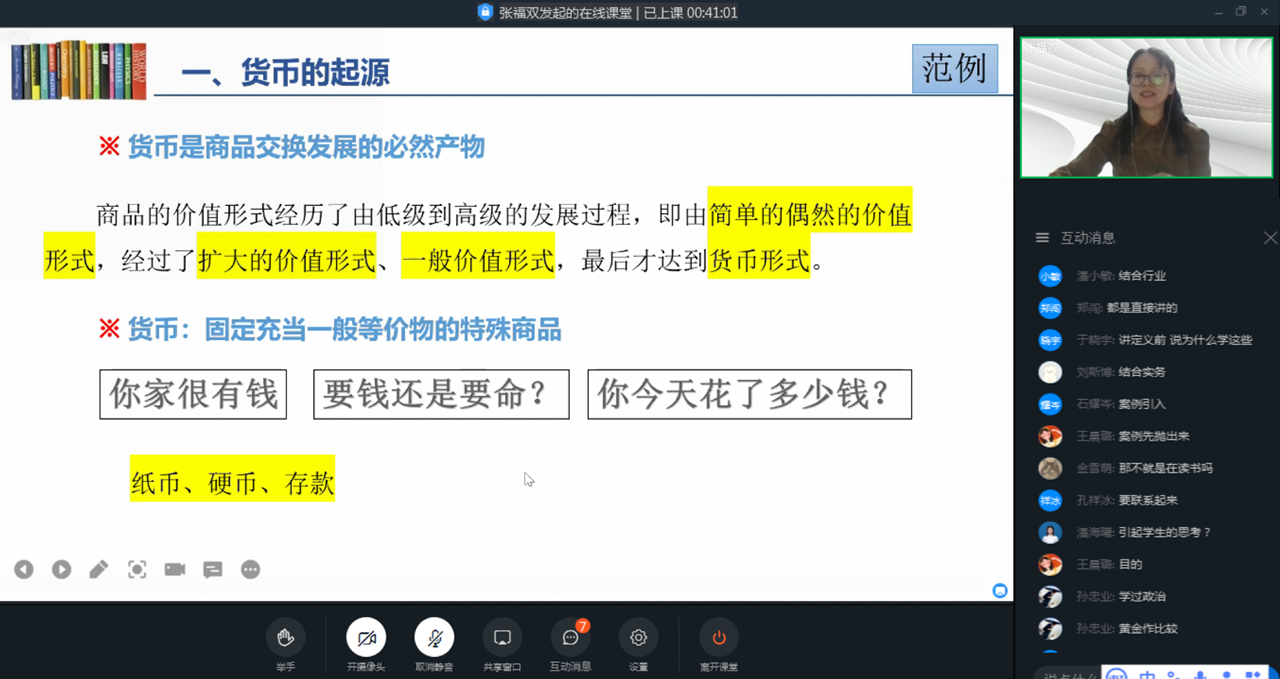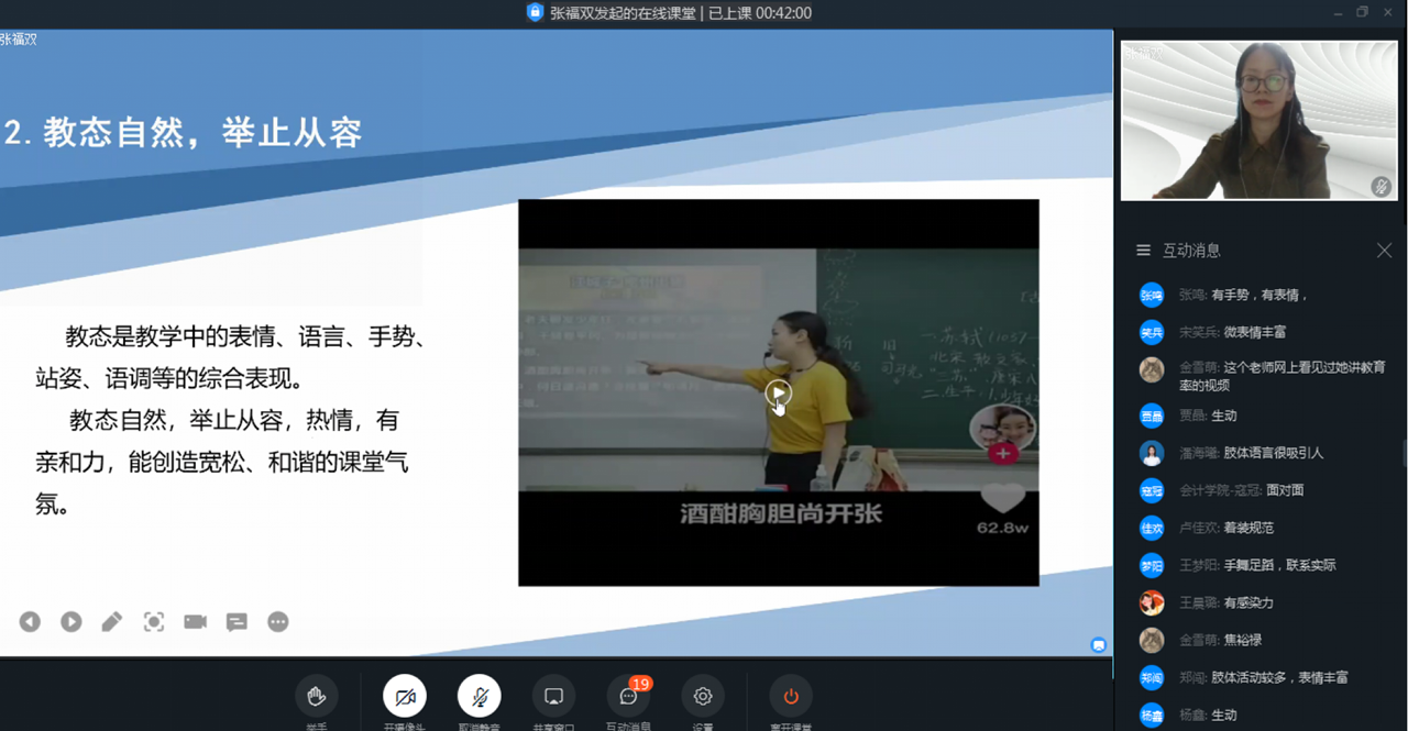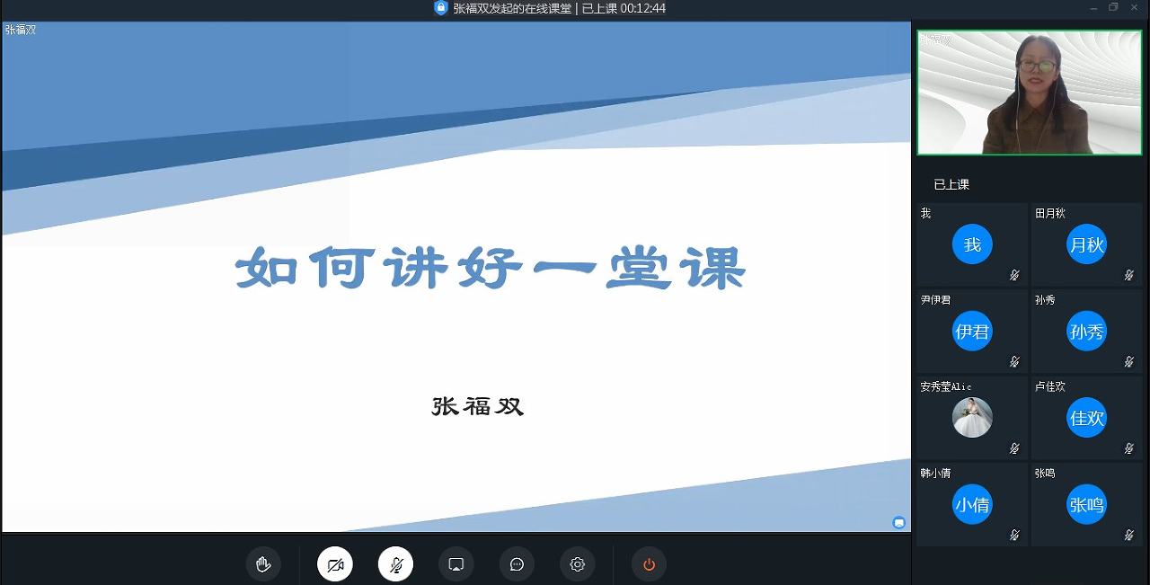 本次培训由金融学院张福双教授主讲“如何讲好一堂课”。张福双教授从“充分备课,打下坚实基础”和“真心付出,打造魅力课堂”两部分,分享了自己从教多年来的教学经验。充分备课就是要做好备内容、备思路、备方法、备素材、备课件和备板书;打造魅力课堂则是从方法灵活事半功倍、教态自然举止从容、厚积薄发专业取胜、拉近距离赢得信赖、引领思想教书育人、爱岗敬业砥砺前行等七个角度进行详细讲解。她认为,充分备课是基础,要根据教学大纲和我校学生的特点,科学、合理、有效地运用各种教学资源,引导学生去思考,呈现出高质量的课堂教学。张福双教授以自己的亲身教学体验、分享了一些教学技巧,剖析了一堂课背后的功夫。本次培训内容丰富,案例真实生动,在线培训过程中互动不断,张教授抛出问题,青年教师积极回答;同时青年教师不断地提出自己在教学中遇到的问题,张教授也集中进行了解答。张教授鼓励青年教师,如果自己想要闪闪发光,就要熬过一个个不为人知的黑夜。