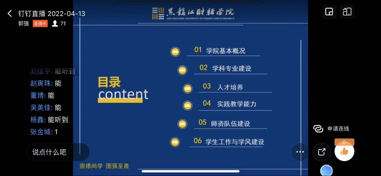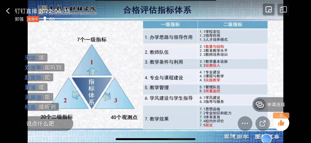 由于疫情原因,讲座采取钉钉线上直播的形式。本次讲座主要对评估指标体系进行了解读,包括合格评估的含义及主要目的,合格评估的核心内涵等。通过对7个一级指标、20个二级指标、40个观测点的解读,让大家更加明确合格评估工作的主要内容和侧重点,在此基础上结合观测点阐述了学校的办学理念、思路、定位等。同时,从学院基本概况、学科专业建设和人才培养等6各方面向全院教职工介绍了金融学院的基本情况,查摆存在的问题。最后,将评估指标体系与我院基本情况相结合,进一步阐明了在评估过程中大家需要做什么、能做什么。