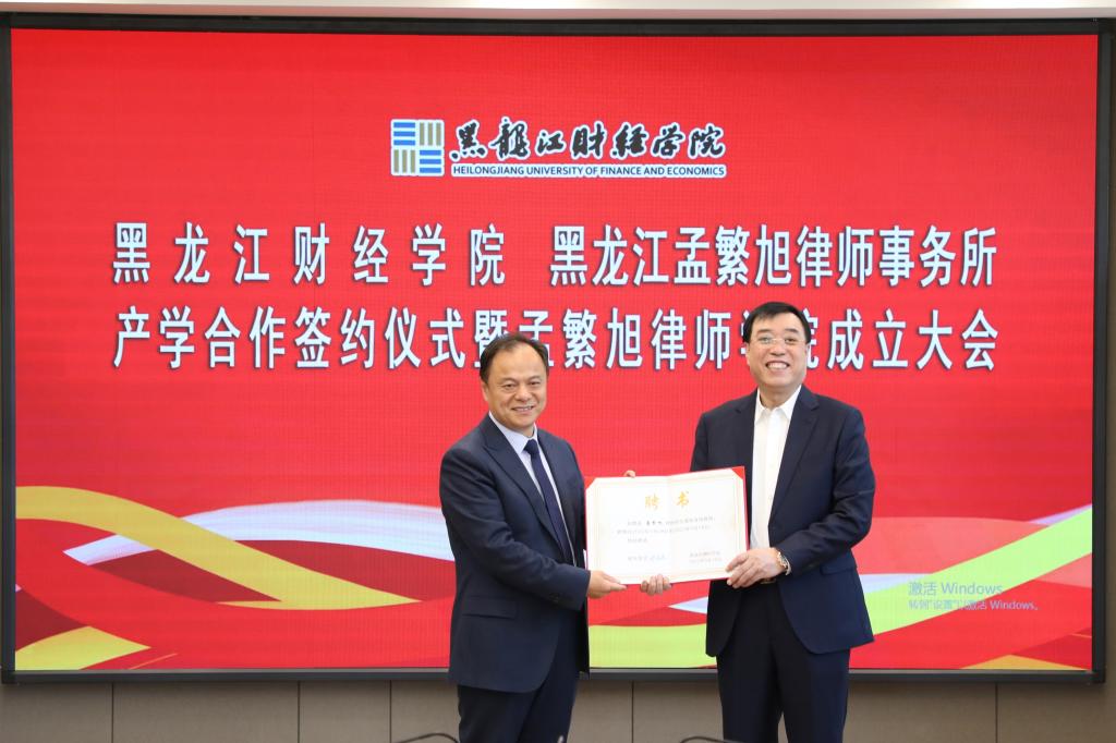 会上,双方签订了校企合作协议书,举行了孟繁旭律师事务所合作共建实习就业基地授牌仪式和孟繁旭律师学院揭牌仪式。于长福为孟繁旭颁发黑龙江财经学院决策咨询委员会专家委员聘书、黑龙江财经学院客座教授聘书和孟繁旭律师学院院长聘书。