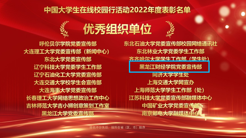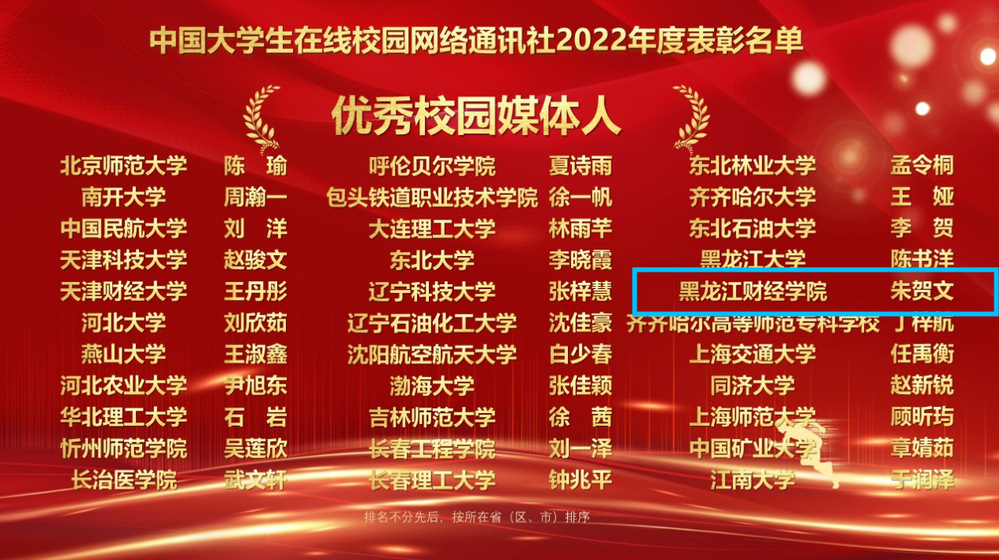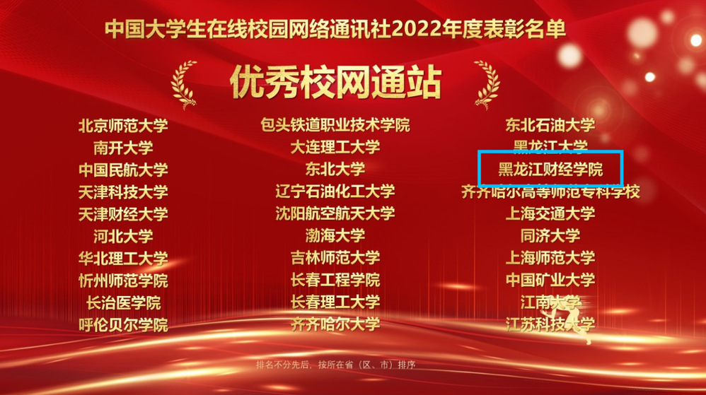 会议揭晓了中国大学生在线2022年度校网通站及校园行活动表彰名单。黑龙江财经学院荣获“优秀校网通站”,校党委宣传部皮天宇荣获“校网通优秀指导教师”,校全媒体中心学生干部朱贺文(管理学院2020级旅游管理1班)荣获“优秀校园媒体人”,校党委宣传部荣获“2022年校园行优秀组织奖”,以上荣誉是东北地区唯一获奖的民办高校。