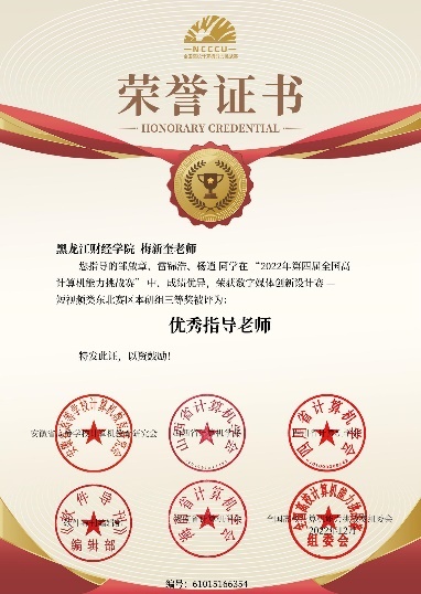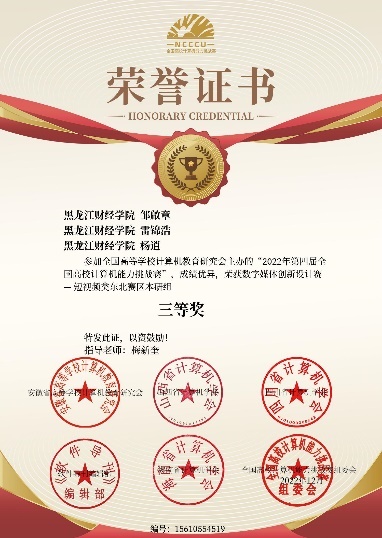 全国高校计算机能力挑战赛数字媒体创新设计类含平面设计类、动画设计类、短视频类、技术应用类等四个版块,2022年我院参与了短视频类、技术应用类两项团队赛,最终由梅新奎老师指导的21计算机科学与技术2班邹啟章、雷锦浩、杨逍荣获数字媒体创新设计赛-短视频类东北赛区本研组三等奖。