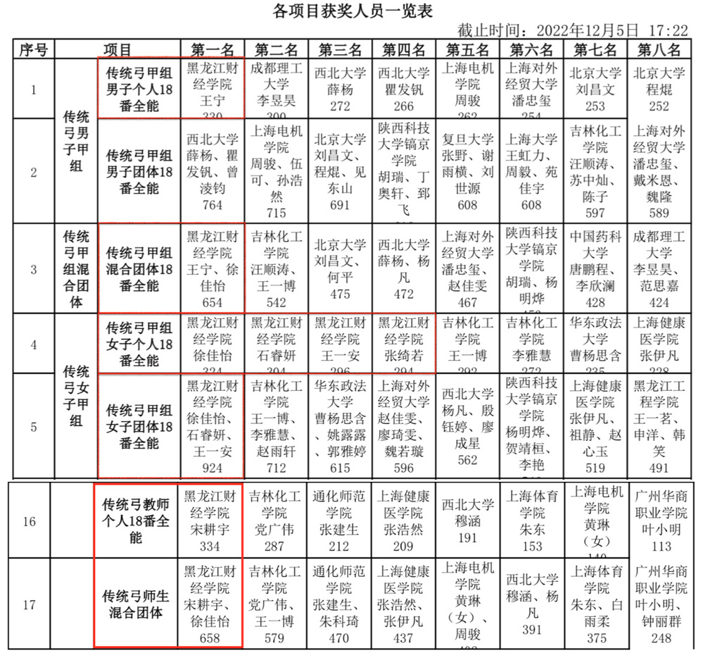 经过2天的激烈竞争,我校射箭队顽强拼搏、不惧强敌,展示了龙财学子良好的精神风貌和竞技风范,最终获得传统弓甲组6个第一名、1个第二名、1个第三名、1个第四名的优异成绩。